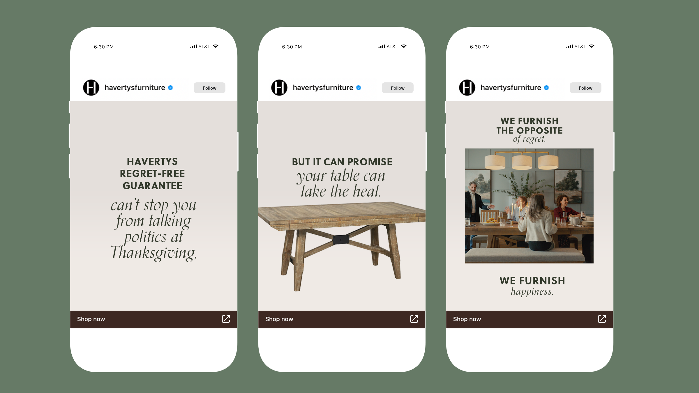 The Creative Solution: Havertys Regret-Free Guarantee. An unofficial, official promise that if you shop with Havertys, your happiness and your furniture will both last a long time. Because Havertys believes, furniture shopping doesn’t have to suck, that there’s a right way and a wrong way to shop, and you shouldn’t have to live with furniture regret. They believe this so much, they guarantee it.